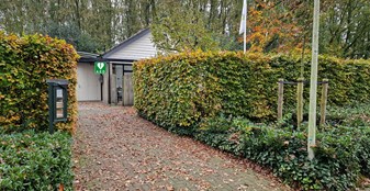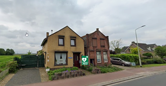 Deze AED hangt bij Bed en Breakfast "Het Posthuis". Rechts naast witte garagedeuren, onder de carport